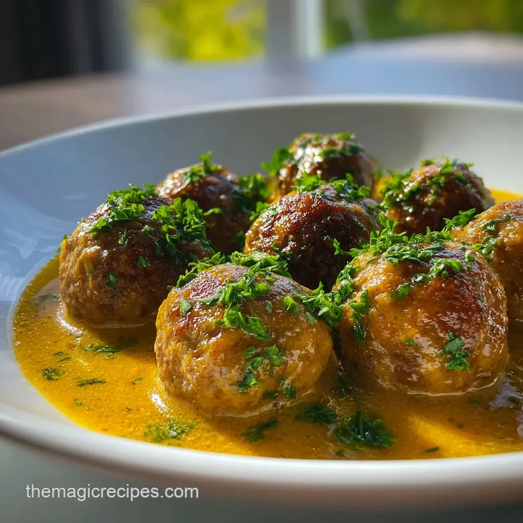 - Flavor/Texture Hook: Silky almond sauce with savory, melt in-your mouth meatballs