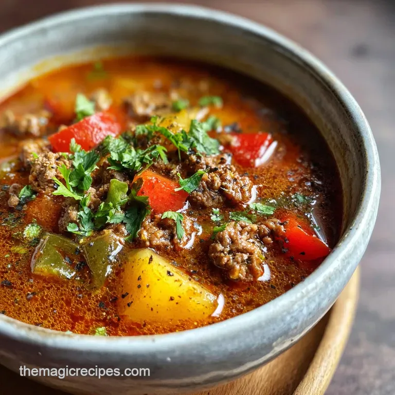 If you want to come home to dinner ready, you can make this a "stuffed pepper soup recipe crockpot ground beef" version. Brown the beef and onions first (don't skip this step or the texture will be weird), then throw everything except the rice and parsley into the crockpot. Cook on low for 6 hours.